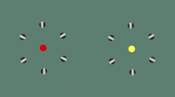 Черно-белые шары вращаются по и против часовой стрелки. Но попробуйте сосредоточить взгляд на желтом или красном круге.