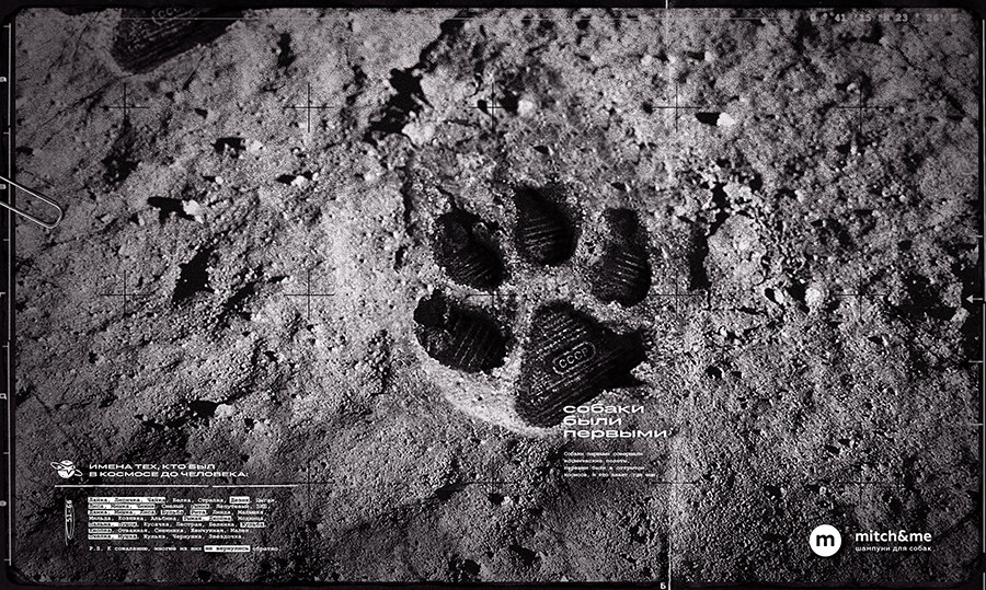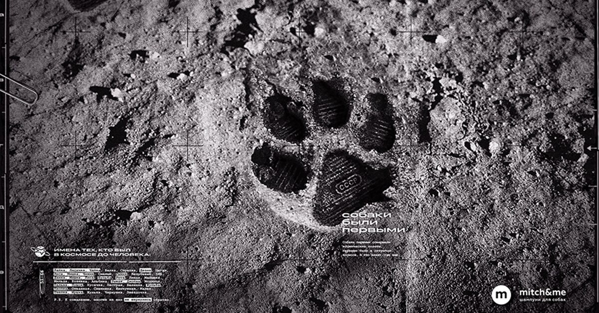 Бренд шампуня для собак Mitch&Me решил напомнить о первых космонавтах,которыми были не люди. Вместе с креативным агентством Jekyll&Hyde компаниясоздала принт с отпечатком собачьей лапы на Луне. След оставили в юго-западнойчасти Моря Спокойствия — там в 1969 г. сел корабль Нила Армстронга,первого человека, побывавшего на Луне. Рельеф отпечатка лапы похож на подошвуботинок легендарного космонавта и имеет маркировку СССР — потому что«подавляющее большинство исследований с собаками было проведено именноСоветским Союзом», объяснили в агентстве.