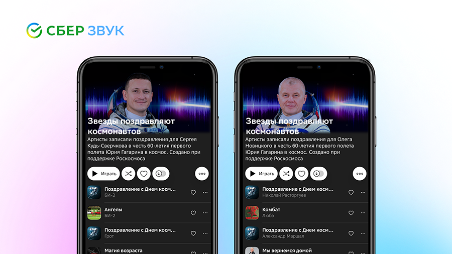 Наконец, свой digital-арт для Esquire представила креативная студия AvocadoToast вместе с музыкантом Moa Pillar. Их произведения называется «Обращение» ипосвящено полету Юрия Гагарина на орбиту.Плейлист на орбитеЕще одно послание космонавтам записал «Сберзвук» — команда аудиосервиса вместес «Роскосмосом» узнала у экипажа МКС, каких музыкантов они больше всего любят,а затем попросила артистов записать поздравления для космонавтов. Из этихаудиосообщений и треков музыкантов собрали плейлисты под названием «Звездыпоздравляют космонавтов».