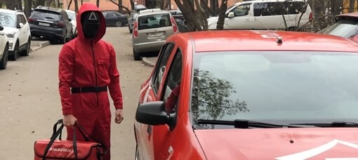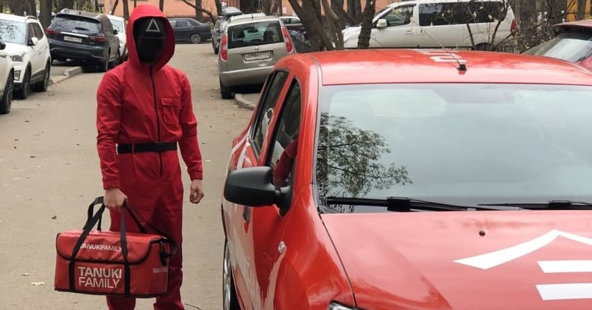 Tanuki Family запустила в Москве доставку с помощью курьеров, переодетых внадзирателей из сериала «Игра кальмара», сообщила пресс-служба сети. Они одетыв малиновые комбинезоны, а их лица спрятаны под сплошной черной маской сизображением треугольника. Встретить их пока что можно в центре Москвы и врайоне Хамовники. Как сообщает сеть, «Тануки» стала первой компанией в России,переодевшей своих сотрудников в героев «Игры в кальмара».