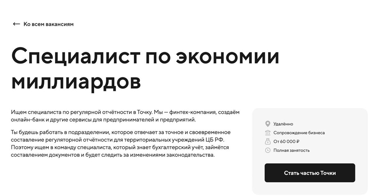 В вакансиях банка «Точка» вместо профессии «бухгалтер» появились «Главныйсоветник по управлению временем», «Специалист по развитию отношений сналоговой», «Специалист по экономии миллиардов» и другие описания, раскрывающиесуть профессии.