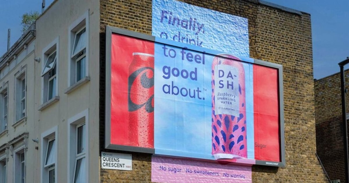 До этого Dash сделал еще одну акцию против конкурента. На стене дома вЛондоне появился билборд, на котором видны фирменные цвета и шрифт Coca Cola.Однако большая часть экрана перекрыта рекламным баннером Dash, которыйзакрывает логотип, похожий на знак Coca Cola. Слоган кампании: «Нет сахара. Нетподсластителей. Нет тревоги».