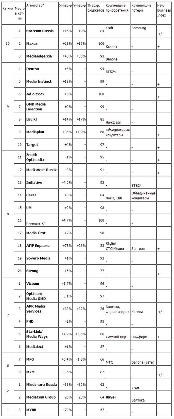 По независящим от редакции причинам в отчет не попали следующие потенциальные фигуранты рейтинга: ACG, Art-Com WWP, FCB Media, LBL, Made, Mliner, Prior, Sorec Media, Strategist Media, Аллен-Медиа.
