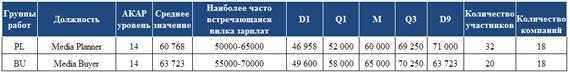 В исследовании приняло участие 76 рекламных агентств. По итогам исследования получены данные по заработным платам более чем 2600 сотрудников рекламных агентств. Также обновлены должности по направлениям медиа, креатив и BTL, и прописан должностной функционал по направлению Digital.
