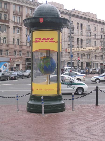 В 2007 году впервые для рекламы бренда DHL внутрь рекламной тумбы был помещен глобус с летящим вокруг земного шара самолетом DHL, столицы стран на материках светились красными диодами.