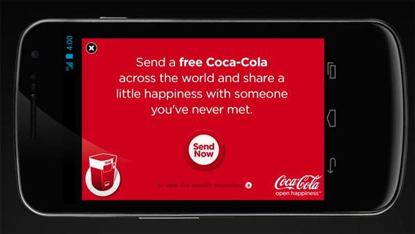 Это приложение для смартфонов позволяет пользователям посылать бутылки Coca-Cola незнакомцам по всему миры при помощи специальных автоматов. Таким образом отдали дань классической рекламе «Вершина холма» (Hilltop) (Я хотел бы купить Coke ему миру)