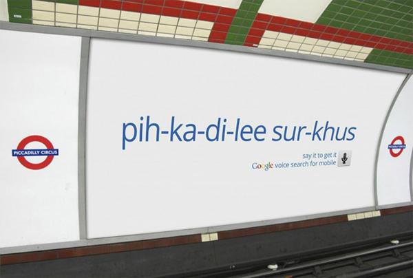 Этот привлекательный и причудливый рекламный щит в Лондоне продвигает Google Voice Search, созданный в тандеме с креативным агентством BBH, представившим более 150 рекламных объявлений с фонетической транскрипцией и описанием близлежащих достопримечательностей, начиная от Пиккадилли и до Лестер-сквер.