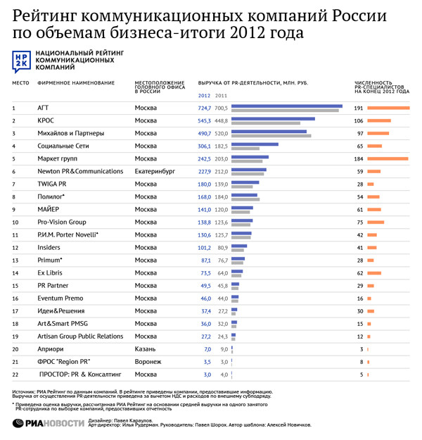 Суммарные доходы от PR-деятельности российских коммуникационных компаний, включенных в рейтинг, выросли в 2012 году на 12% — до 3,8 миллиарда рублей.
