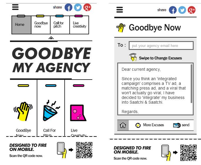 Клиентам предлагают отсканировать QR-код и посетить «Прощай, моей агентство» - мобильный сайт с набором ироничных, готовых к отправке писем, которыми клиенты могут воспользоваться при увольнении агентств.