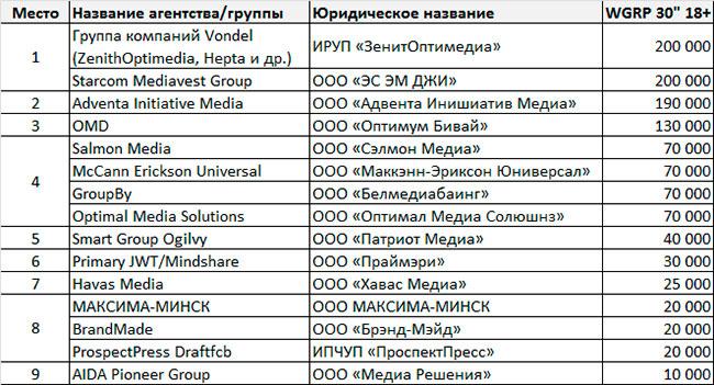 Тем не менее, не смотря на такие оптимистичные темпы роста, рынок остается непрозрачным ‑ в Беларуси, в отличии от России и Украины не публикуются клиентские листы рекламных агентств и их оборот. Консалтинговая компания Media audit совместно с Marketing.by решили восполнить этот пробел и представили первый рейтинг медийных агентств по объемам размещения на ТВ за 2013 год. Как считалось: При составлении данного рейтинга не стояла задача максимально точно определить объемы размещения. Данное исследование скорее представляет собой приблизительный срез по крупнейшим международным рекламным группам и клиентам (как международным, так и локальным). Основная цель данного исследования ‑ создать независимый рейтинг медийных агентств для большей прозрачности белорусского медийного рынка и определить лидирующие рекламно-коммуникационные группы. Организаторы рейтинга HЕ не ставили перед собой задачу собрать информацию об оборотах рекламных компаний или оценить бизнес рекламных агентств. За основу клиентских листов брались данные из открытых источников ‑ база российских рекламодателей и обслуживающих их агентств/рекламных групп на adindex.ru, из публикаций в открытых источниках результатов региональных тендеров и рекламных активностей (sostav.ru/adindex.ru/marketing.by), собственных клиентских листов агентств опубликованных в открытых источниках. В виду того, что организаторы рейтинга не могут знать взаимоотношений и задач, стоящих перед локальными представителями глобальных международных рекламно-коммуникационных групп, а также их взаимоотношения с данными группами, то при составлении рейтинга использовался следующих подход ‑ при обслуживании клиента в глобальной (международной) рекламной сети все WGRP 30' 18+ данного клиента, набранные за период 2013 года присваиваются локальному агентству, представляющему интересы глобальной сети в Беларуси. Для оценки использовались топ 200 ТВ рекламодателей за 2013 год по объему выкупленных WGRP 30' 18+ (это 70% от всех WGRP 30' 18+ размещенных за 2013 год). Не учитывались при анализе телемагазины и анонсы мероприятий. Наименования агентств и принадлежность к рекламным группам определялась на основании данных о подписчиках базы данных ГЕВС