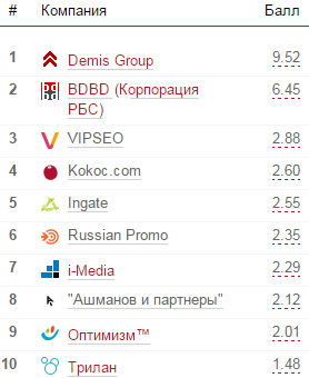 Первое место чарта заняло группа компаний Demis, на втором месте BDBD (входит в корпорацию РБС), бронзу получило агентство VIPSEO.