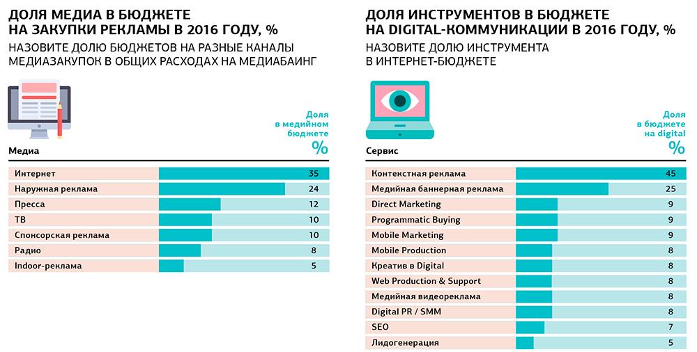 На маркетинговые активности (участие в выставках, событийные мероприятия и другие виды consumer promotion) застройщики в этом году потратили 12% от бюджета на продвижение (14% в 2015 году). Существенную долю в бюджете продолжают занимать креативные разработки: на создание коммуникационной платформы в 2016 году компании направили 6% рекламного бюджета, хотя в прошлом году этот показатель был больше – 8%. Не экономят застройщики и на дизайне и брендинге, стабильно вкладывая 7% в визуальную идентификацию компаний. Производство рекламных материалов в этом году занимает 7% (в прошлом – 8%) в расходах.