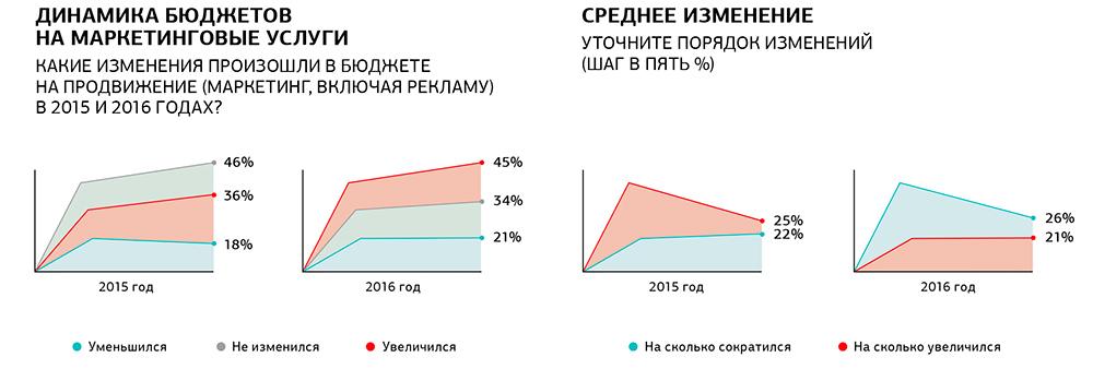 В 2015 году у почти половины (46%) опрошенных застройщиков рекламный бюджет не менялся по сравнению с 2014 годом. На повышение тогда решилась треть компаний (36%) – в среднем, они выделили дополнительные 25% на продвижение. В текущем году расходы увеличило большинство респондентов (45%), но прирост у них был уже меньше – 22%. Доля рекламодателей, сокращавших бюджет, в последние два года сильно не менялась: 18% в 2015 году и 21% в текущем году. Однако те, кто решился на сокращение инвестиций, провели его более радикально – в среднем оно составило 26% по сравнению с 21% годом ранее.