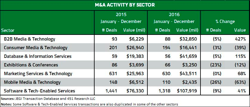 Активность в секторе b2b медиа и технологий показала экспоненциальный рост в стоимости сделок – в основном за счет приобретения Microsoft компании LinkedIn. Объем же сделок был относительно стабильным: в 2016 году было совершено 88 сделок, а в 2015-м – 93. Среди примечательных транзакций четвертого квартала 2016 года можно выделить следующие: IG Group Holdings купила сервис DailyFX, поставщика новостей и аналитики для трейдеров, за $40 млн, Brunico Communications приобрела определенные маркетинг- и медиактивы Rogers Media, DN 2.0 купила Dealernews у UBM.