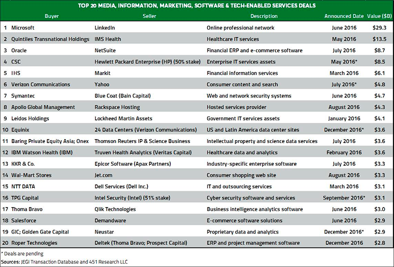 Крупнейшие сделки 2016 года в сегменте СМИ, рекламы, маркетинга, программного обеспечения, а также в технологическом секторе