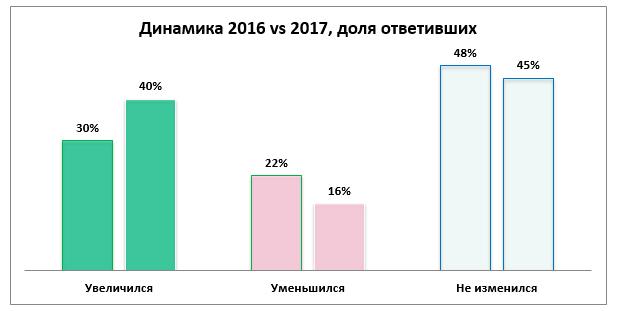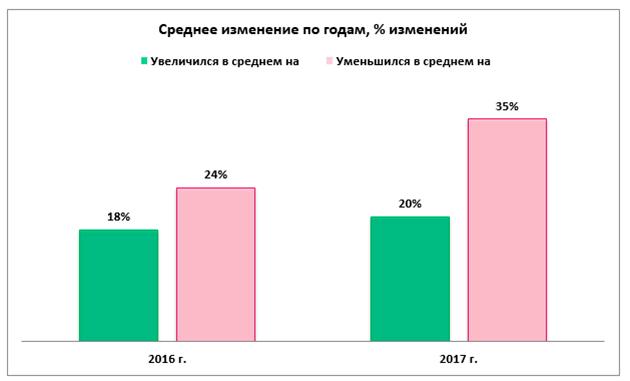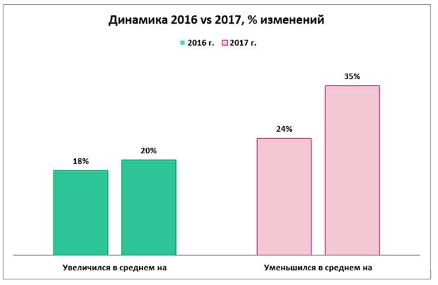 Тем, кто ответил на вопрос по динамике, предлагалось указать порядок изменений (роста или сокращения бюджетов) по сравнению я предыдущим годом. Оказалось, что наращивание бюджетов в среднем происходит более умеренно, чем сокращение. Так, если бюджет увеличивается, то, в среднем, на 20% (что на 2 п. больше, чем годом ранее), а уж если сокращается, то более драматично – в среднем на 35%, что на 11% больше, чем в 2016 году.