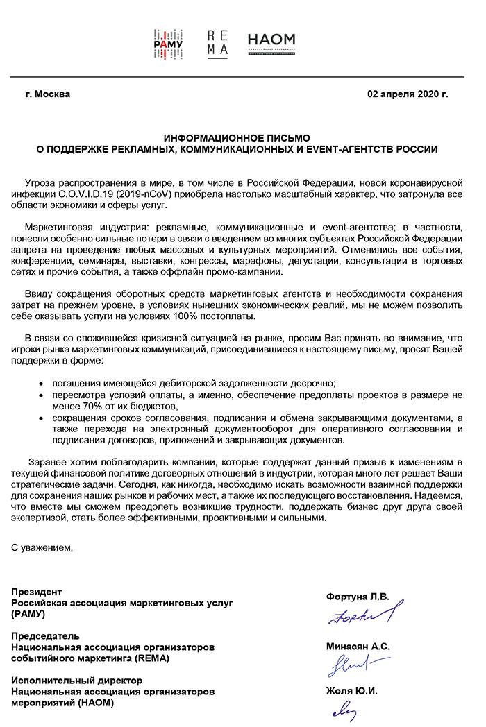 Авторы письма призывают клиентов и партнеров изменить существующую финансовую политику договорных отношений. Чтобы поддержать рынок маркетинговых коммуникаций, игроки просят досрочно погасить имеющиеся дебиторские задолженности, обеспечить предоплату проектов в размере не менее 70% от их бюджетов, а также сократить сроки согласования, подписания и обмена закрывающими документами и перейти на электронный документооборот для повышения оперативности.