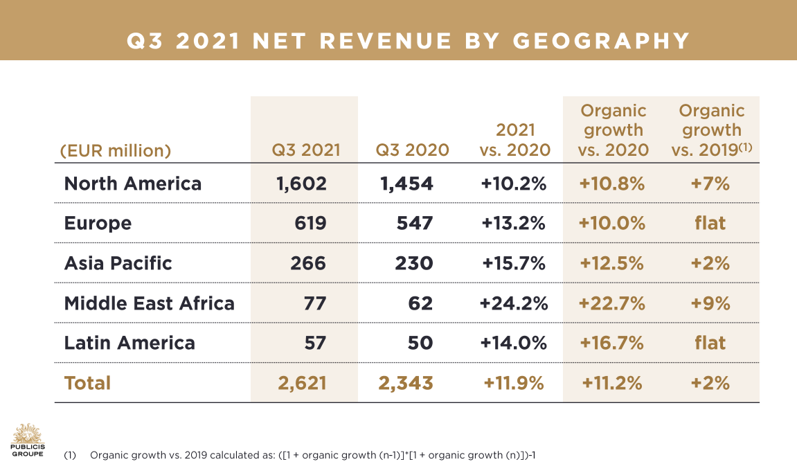 Органическая выручка Publicis Groupe за июль — сентябрь выросла на 11,2% годк году и на 5% — к «допандемийному» 2019 г. Об этом говорится впрезентации финансовых результатов компании за девятьмесяцев и третий квартал 2021 г. В денежном выражении доходы группы составили€2,6 млрд.