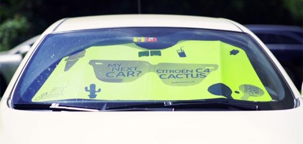 Представители Citroën реализовали в Швейцарии оригинальную идею для продвижения C4 Cactus в солнечные летние дни. Креативщики из агентства franz & rené разработали защитный козырек для автомобиля, который волонтеры просто раздали автомобилистам на парковке перед пляжной зоной. Безусловно, многие были обрадованы такому подарку и моментально им воспользовались, попавшись на уловку бренда.