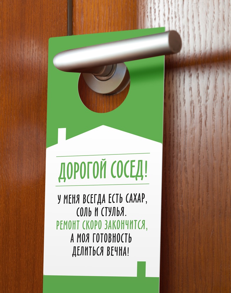 Начиная с февраля в московских магазинах сети будут установлены стенды с бесплатными табличками на дверные ручки. С их помощью можно оповестить соседей о дате окончания ремонта и принести извинения за неудобство в забавной форме.