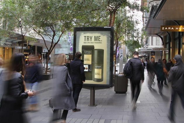 JCDecaux разработал рекламные конструкции с диспенсерами, оборудованными детектором движения для бесплатной раздачи образцов последнего аромата бренда LYNX (входит в портфель Unilever, на российском рынке изветен под названием AXE) в Сиднее, Мельбурне и Брисбене