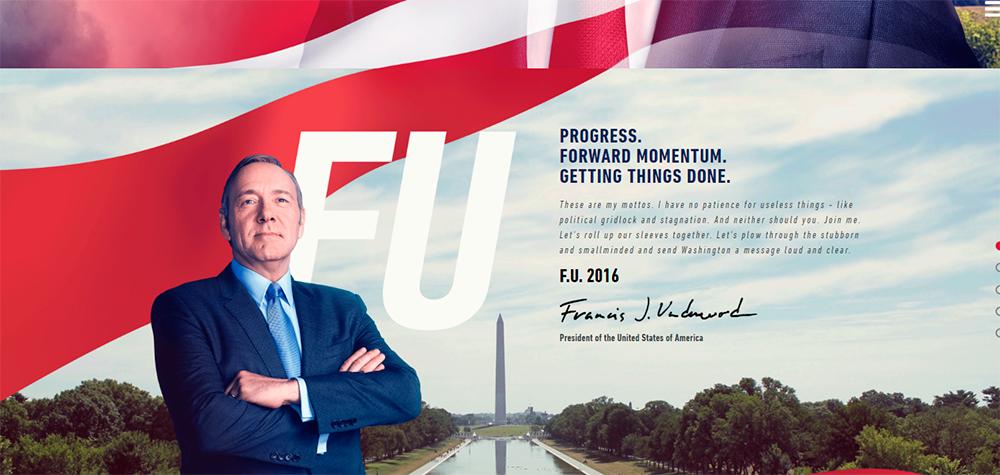 К запуску нового, четвертого сезона креаторы создали настоящую политическую пиар-кампанию для главного героя – политика Фрэнка Андервуда. «Кандидат в президенты» даже выступил на канале CNN с агитационной речью, причем фейковое заявление транслировалось во время проведения дебатов кандидатов в президенты от Республиканской партии. Ролик посмотрели 18 миллионов зрителей, новость мгновенно попала в топ Twitter и Facebook, затмив обсуждения реальных кандидатов на пост американского лидера.
