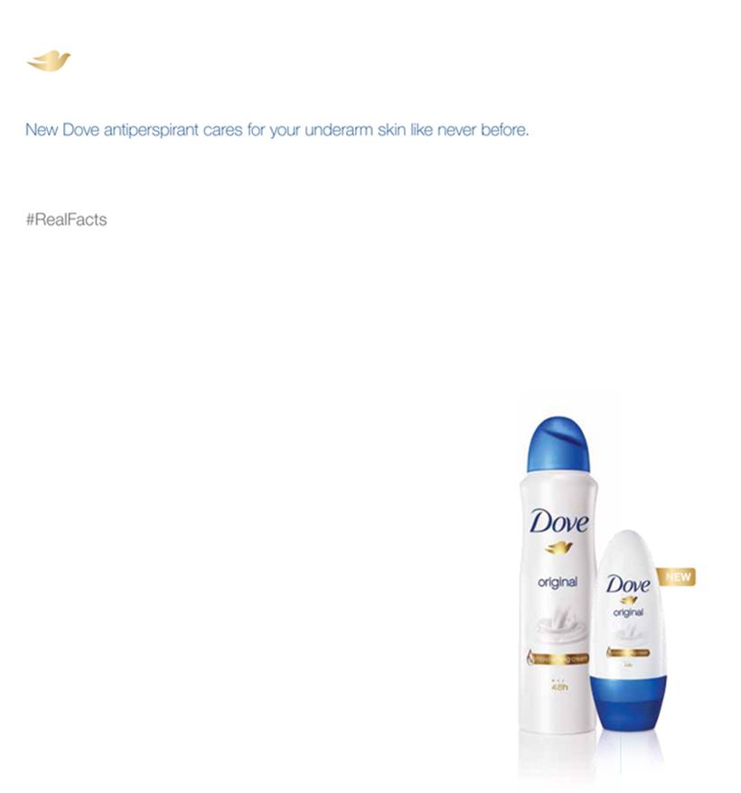 «Новый антиперспирант Dove увеличит ваш IQ на 40 пунктов», «Новый антиперспирант Dove впервые был использован Клеопатрой», – гласили надписи на странице и стоял хештег #AlternativeFacts. На другом развороте был изображен тот же флакон, но с хештегом #RealFacts сообщалось, что «Новый антиперспирант Dove ухаживает за кожей ваших подмышек, как никогда раньше».