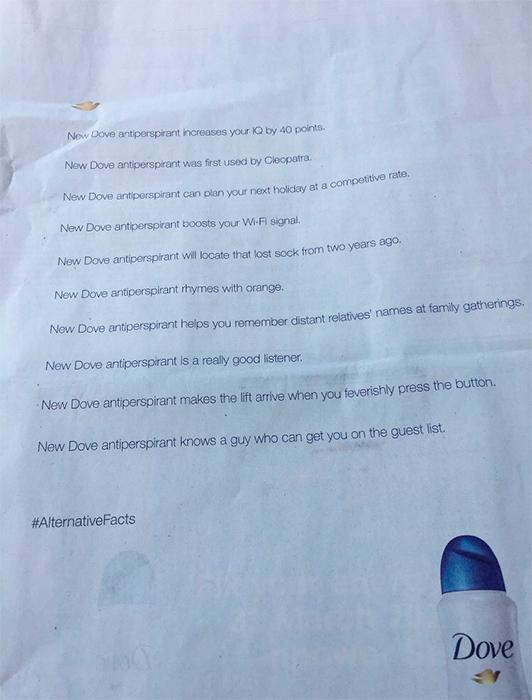 «Новый антиперсперант Dove улучшит ваш Wi-Fi-сигнал» – это и другие рекламные объявления появились в британских газетах и сопровождались хештегом #AlternativeFacts, который стал мемом благодаря помощникам Трампа