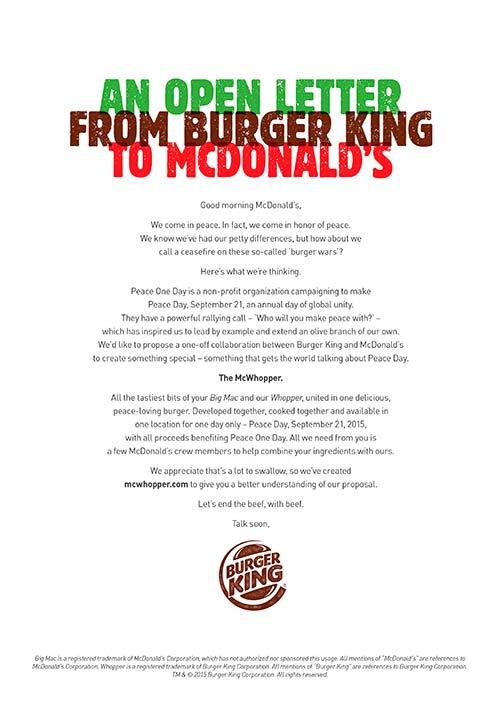 1. Burger King, McWhopper, Y&R (Новая Зеландия) Burger King предложил McDonald`s помириться и создать бургер вместе. Компания 26 августа разместила в New York Times и Chicago Tribune рекламу, в которой обратилась к своему главному конкуренту с инициативой наконец сложить оружие и создать что-то вместе в честь Дня Мира. Генеральный директор McDonald's Стив Истербрук ответил Burger King в Facebook.