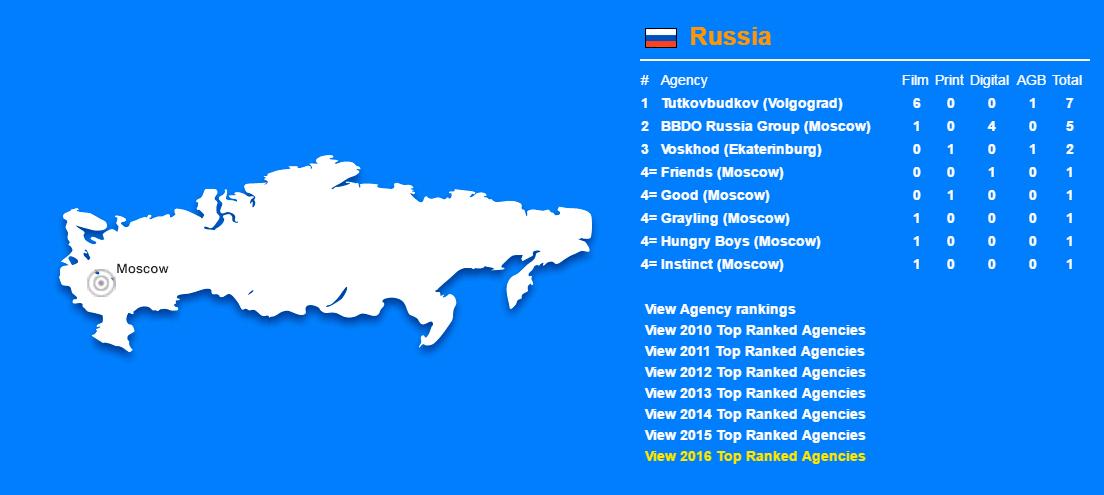 В общем рейтинге креативности Россия в 2016 году заняла только 21 место (в 2015 году было 30 место, а в 2014-ом – 27). Самым награждаемым агентством было признано Tutkovbudkov из Волгограда, на втором месте – BBDO Moscow. Замыкает тройку лидеров «Восход» из Екатеринбурга.