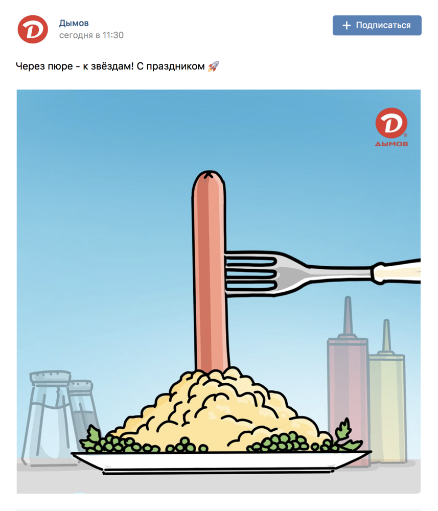 Производитель колбас и мясных деликатесов «Дымов» поздравил с Днем космонавтики фразой, которая хорошо ложится на слух.