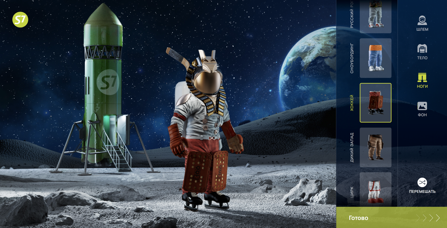 В преддверии дня космонавтики S7 Airlines совместно с агентством Eventum Premo запустили сайт «Кто вы в космосе?», благодаря которому каждый может создать скафандр на свой вкус. Можно выбрать шлем, затем изменить внешний вид тела, ног и поменять фон. После этого полученным изображением можно поделиться в соцсетях.