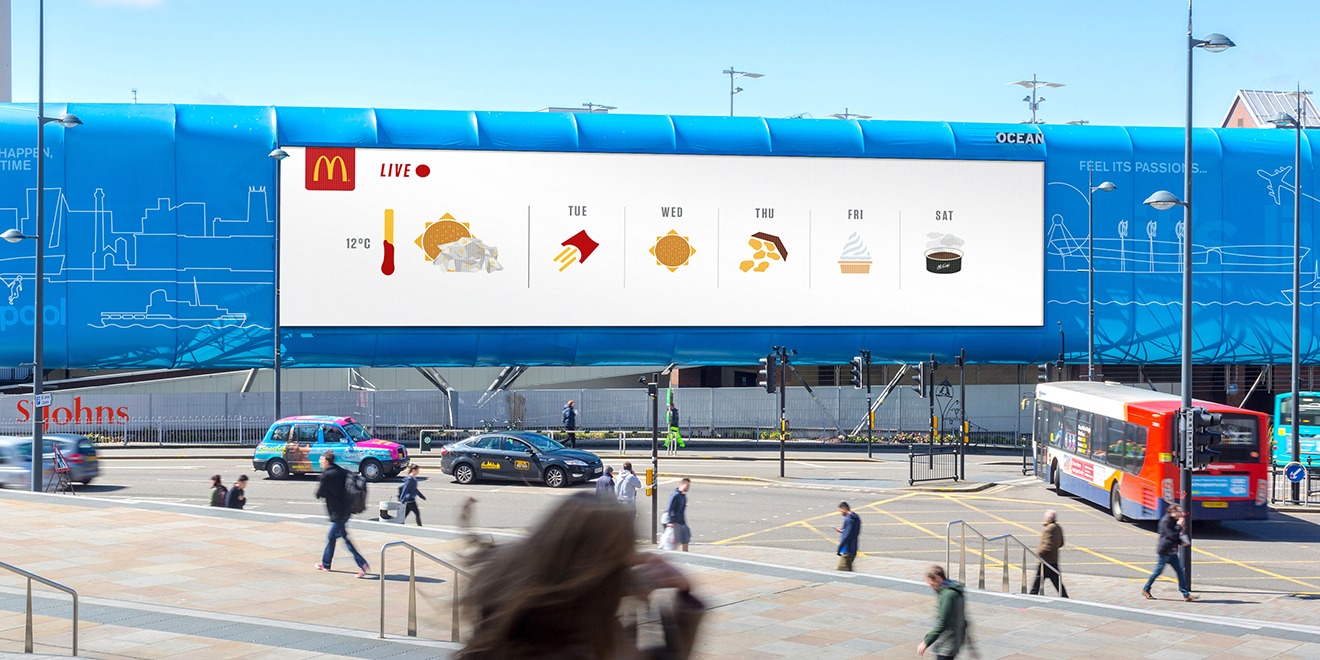 Биг Мак превратили в иконку солнечной погоды, а перевернутая упаковка с картофелем фри обозначает в прогнозе дождь. McDonald's собирает данные о погоде у метеорологической службы Великобритании и обновляет информацию на билбордах в режиме реального времени.
