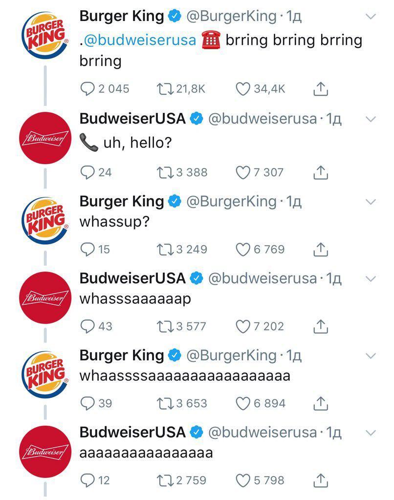 Компании Burger King и Budweiser решили воссоздать одну из самых успешных рекламных кампаний Bud, которая в прошлом была награждена премией международного рекламного фестиваля «Каннские Львы» и даже стала культурным феноменом. В новом ролике вместо друга с пивом в квартиру звонит король Burger King'a с бургерами и тоже кричит «Wassuuuuuuuuup» (сокращение от whats up). Новая рекламная кампания также сопровождалась активностью в соцсетях.