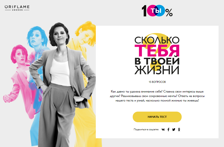 На промостранице компании предлагается пройти тест и узнать, «сколько тебя в твоей жизни». В рамках кампании Oriflame также запустила конкурс на раскрытие своего потенциала #живунавсесто и флешмоб #имненестыдно и попросила женщин рассказать в соцсетях, что они делают исключительно для себя.