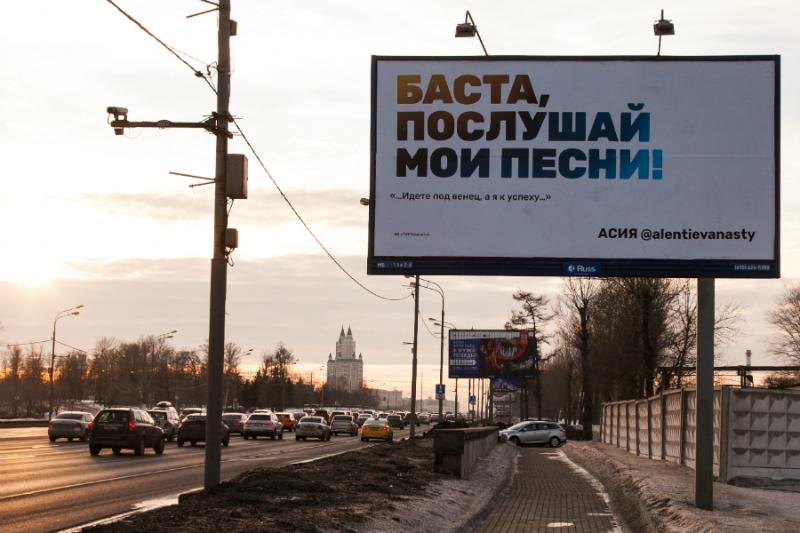 На билбордах вдоль дорог Москвы появились баннеры, размещенные от имени четырех участников музыкального проекта телеканала — «Песни». В своей рекламе они обращались к судьям реалити-шоу, рэперам Тимати и Басте, с просьбой прослушать их песни. Ни на одном щите не было размещено ни логотипа телеканала, ни названия самого проекта