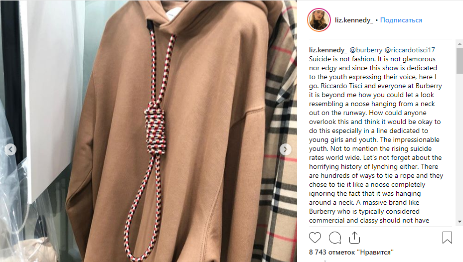 Одна из моделей этого показа Лиз Кеннеди раскритиковала Burberry в своем аккаунте в Instagram. «Самоубийство — это не мода... Я не понимаю, как вы могли выпустить на подиум лук со свисающей с шеи петлей висельника», — возмутилась она.