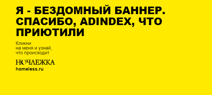 Благотворительная организация «Ночлежка» совместно с агентством Action запустила социальный проект «Бездомный баннер», сообщают AdIndex представители фонда. Таким способом организаторы хотят обратить внимание людей на проблемы бездомных в России.