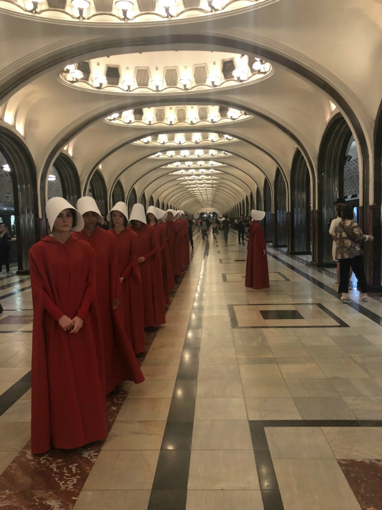 Сегодня на станции Маяковская московского метрополитена и рядом с библиотекой имени Ленина появилась группа девушек в костюмах из сериала «Рассказ служанки». Пользователи социальных сетей выкладывали фото с девушками в красных платьях и белых чепцах.