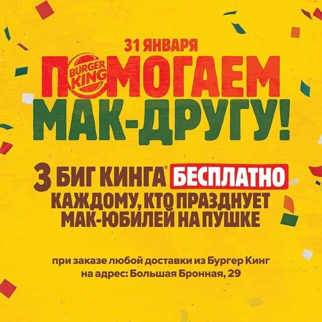 К такому повороту событий, похоже, был не готов конкурент компании, фастфуд-сеть «Бургер Кинг». Сегодня она сообщила в соцсетях, что 31 января раздаст три бесплатных биг-кинга тем, кто закажет еду «Бургер Кинга» к ресторану «Макдональдс» на Пушкинской, где должна была проходить акция. «31 января они собираются с размахом отметить свои 30 лет в ресторане на Пушкинской площади. Будут раздавать Биг Маки по три рубля — это действительно зачетная идея! Единственное — мы немного переживаем, что соберутся огромные очереди, а кому-то из гостей и вовсе не достанется подарка. Мы хотим помочь Макдональдсу накормить всех мак-друзей, чтобы никто не ушел голодным», — говорится в посте «Бургер Кинга».