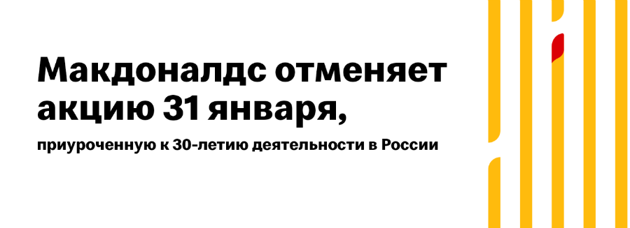 Сеть отказалась от идеи продавать 31 января «Биг Маки» по 3 рубля — такой была их цена, когда компания открыла первый ресторан в России. «Макдоналдс» пообещал найти другой способ и время, чтобы отметить юбилей.