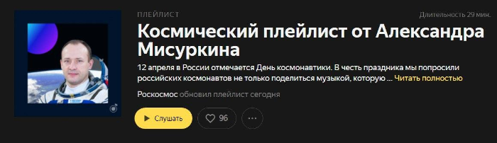 «Яндекс.Музыка» совместно с «Роскосмосом» собрала ко Дню космонавтики плейлисты с любимой музыкой и советами от российских космонавтов.