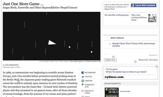 Простая игрушка, с помощью которой можно разбомбить веб-страничку New York Times появилась в газете в качестве иллюстрации к статье “Just One More Game” о повальной мании социальных игр.
