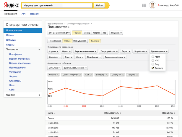 «Скажем, за несколько кликов можно узнать, сколько пользователей и с каких устройств работали с приложением в Нижнем Новгороде на прошлой неделе. Он умеет детализировать и «падения»: например, покажет, у скольких пользователей из России приложение версии 2.34 давало сбой на планшетах», - говорится в сообщении.