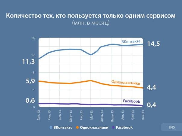 «В 2013 году увеличилось количество людей, которые пользуются только «ВКонтакте» и не заходят в другие социальные сети. В то же время количество людей, которые пользуются другими сетями и не заходят в VK, существенно сократилось. Скоро их не останется», — сообщил Дуров. Он приводит данные, согласно которым в 2013 году суточная аудитория «ВКонтакте» выросла на 14 миллионов пользователей. По сведениям Дурова, ближайший конкурент в лице «Одноклассников», «несмотря на попытки накрутить статистику, рос в два раза медленнее».
