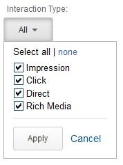 При использовании селектора 'Тип взаимодействия' отчет можно отфильтровать по действиям, которые совершали пользователи, увидевшие рекламу. Доступны 4 варианта: клики, показы (без кликов), прямой канал (с кликом по медийной рекламе и последующим целевым действием) и прямой канал мультимедийной рекламы.