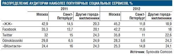 Действительно, Synovate Comcon приводит в исследовании данные по Москве, Санкт-Петербургу и городам-миллионникам. Они показывают, что почти половина аудитории ЖЖ сосредоточена в Москве, при этом ее доля в других городах снижается. Facebook и Twitter значительно наращивают популярность среди пользователей из столицы, в то время как их недельная аудитория в регионах падает. Odnoklassniki теряют пользователей в обеих столицах, но сохраняют стабильное положение в других городах-миллионниках. При этом аудитория «ВКонтакте» в Москве стала существенно больше, чем в родном для сети Санкт-Петербурге.