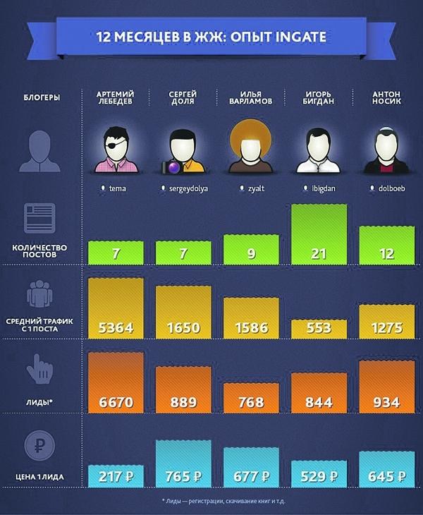Эффективность блогеров Ingate оценивала «лидами». В этот показатель входит количество людей, перешедших из блогов на сайт агентства, регистраций, заявок, новых клиентов. Цена за такой «лид» у блогеров различается: у Артемия Лебедева — 217 руб., а у Сергея Доли — 765 руб. (см. инфографику). «Такая разница в ценах — это естественная ситуация, потому что у Лебедева охват аудитории больше, чем у Носика или у остальных. Это и снижает цену», — пояснила г-жа Антонова.
