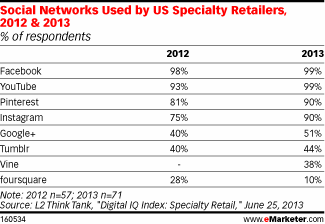 Несмотря на это ритейлеры продолжают инвестиции в соцмедиа, и их присутствие на основных социальных площадках — Facebook, Twitter, YouTube, Pinterest и Instagram — растет. Причем с Twitter, Facebook и YouTube работает 99% ритейла, а с Pinterest и Instagram — 90%. Единственная площадка, которая теряет популярность — foursquare: если в 2012 году на ней присутствовали 28% игроков рынка, то в 2013 всего лишь 10%.