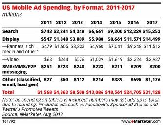 Поиск продолжает оставаться лидирующей категорией мобильной рекламы с 4,43 млрд $ в 2013 году, на втором месте дисплейная реклама – 1,84 млрд $, а на рекламные кампании с привлечением сообщений как канала коммуникации выделят всего 223 млн $. Хотя реклама в мобильном поиске продолжит оставаться наиболее привлекательной для рекламодателей за отчетный период, дисплейная мобильная реклама будет постепенно догонять поисковую - в 2017 году на первую компании потратят 14,5 млрд $, а на последнюю – 15,2 млрд $.